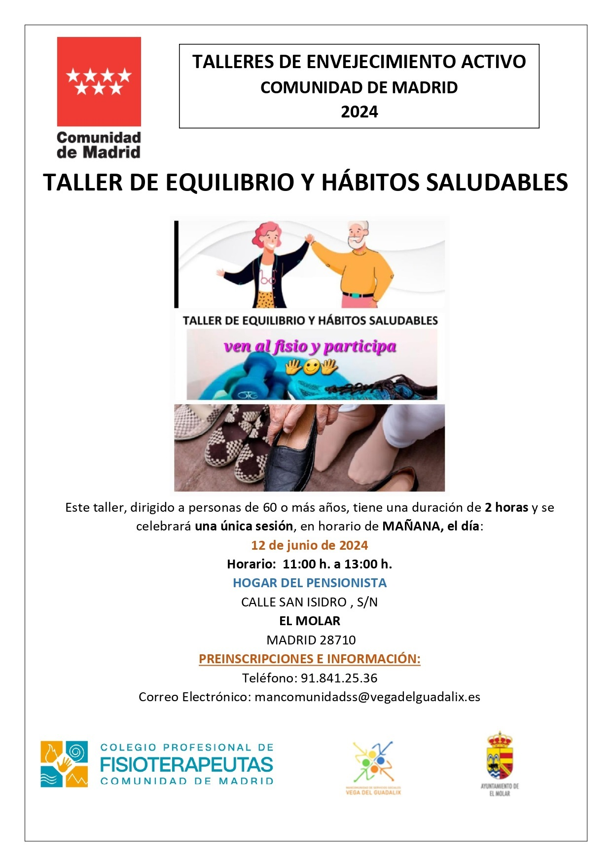 El próximo 12 de junio de 2024 de 11:00 h. a 13:00 h. se va a realizar un taller de equilibrio y hábitos saludables. Este taller va dirigido a personas mayores de 60 años o más. Se va a realizar en el Hogar del Pensionista de El Molar.